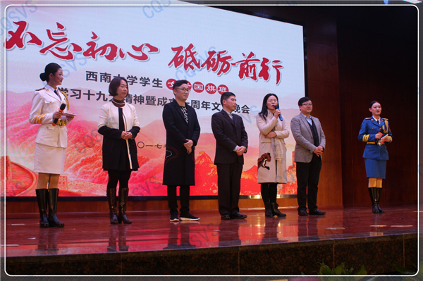 2017年12月9日晚7點(diǎn),西南大學(xué)學(xué)生女子國(guó)旗班學(xué)習(xí)十九大精神暨成立十周年文藝晚會(huì)在第二學(xué)生活動(dòng)中心如期舉行。校方對(duì)于此次文藝晚會(huì)給予了高度的重視,西南大學(xué)黨委副書(shū)記徐曉黎,黨委學(xué)生工作部部長(zhǎng)胡建軍,黨委教師工作部部長(zhǎng)楊毅,心理學(xué)部黨委書(shū)記黃澤文,原校團(tuán)委書(shū)記、重慶市團(tuán)校副校長(zhǎng)王毅出席了此次晚會(huì)。