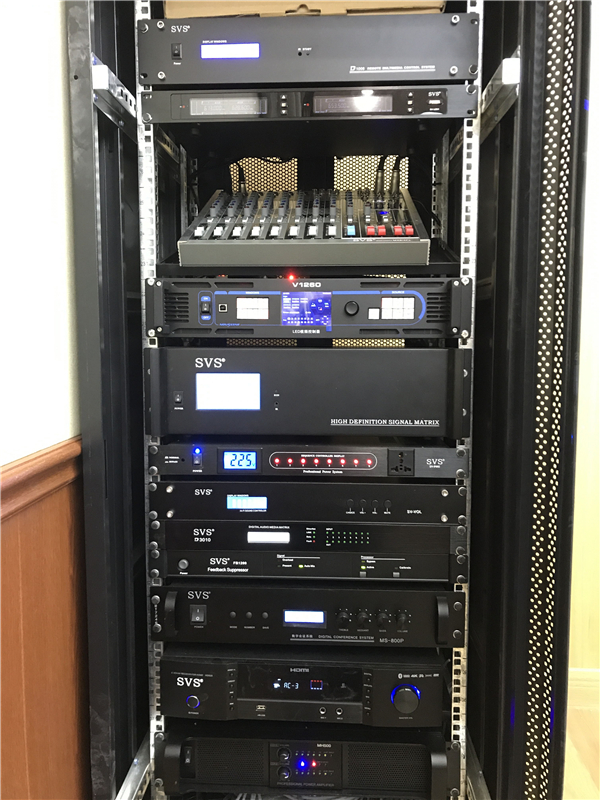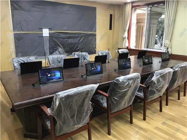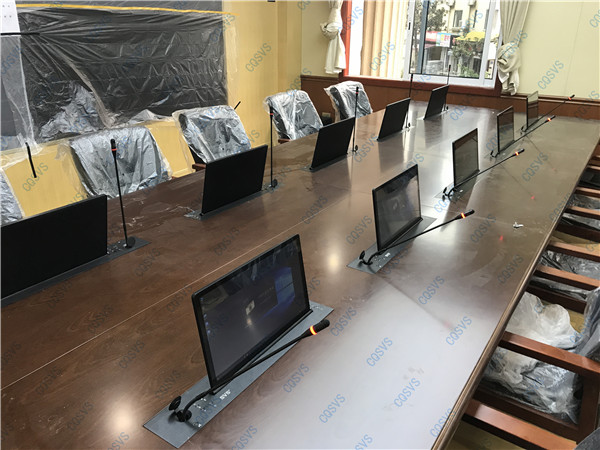 針對本會場共設(shè)置10個席位,為每個席位都配置了帶觸摸帶話筒液晶屏升降器SV-LCD17(TS),配合無紙化軟件的使用,輕松實現(xiàn)普通會議、無紙化會議、多媒體會議等多種會議模式的切換。同時搭配擴聲系統(tǒng)和中控系統(tǒng),整體效果獲得現(xiàn)場一致好評!