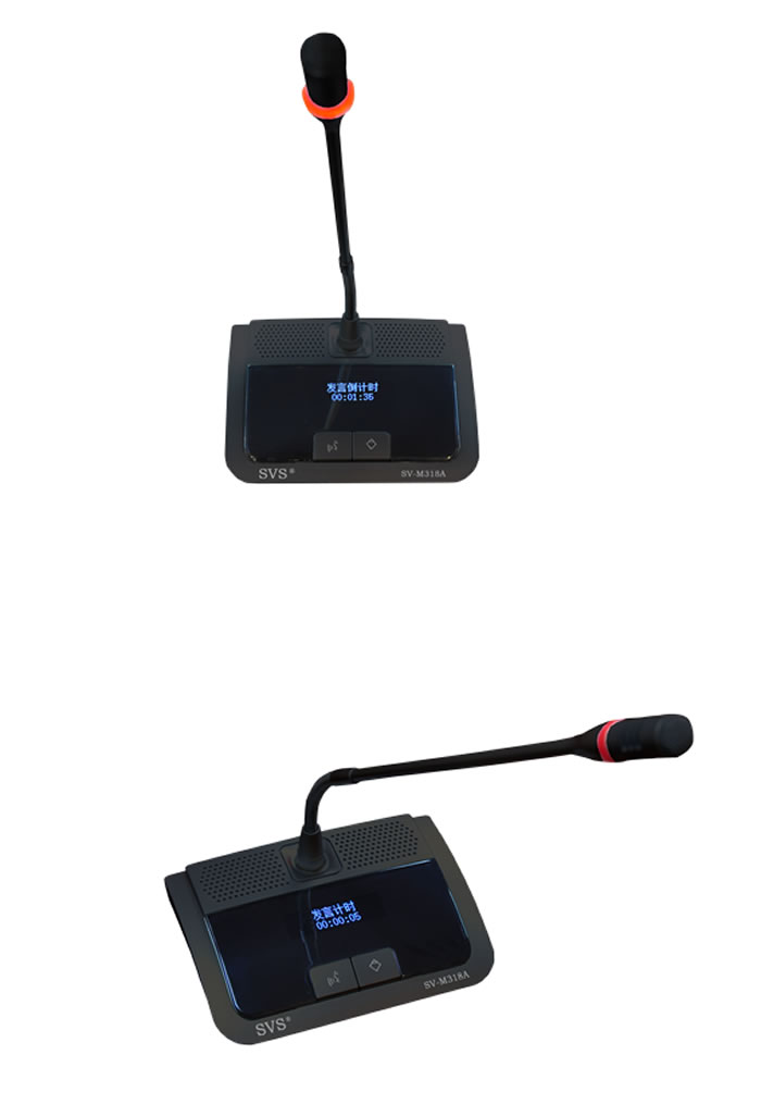 SV-MT318A/B由SVS率先提出功能要求,然后采納德國同行公司的建議,采用目前行業(yè)高亮度、低能耗的OLED顯示技術(shù)(OLED顯示技術(shù)具有自發(fā)光的特性,采用非常薄的有機(jī)材料涂層和玻璃基板,當(dāng) 有電流通過時(shí),這些有機(jī)材料就會(huì)發(fā)光,而且OLED顯示屏幕可視角度大,還能夠節(jié)省電能),此技術(shù)一定能成為會(huì)議行業(yè)里最耀眼的明星,因?yàn)榧词乖诤芄饬恋臅?huì)議環(huán)境里,該話筒的時(shí)鐘顯示也一目了然 。同時(shí)該系統(tǒng)具有多種計(jì)時(shí)模式,在未開啟話筒時(shí),顯示當(dāng)前時(shí)鐘,讓與人人員很便利的了解目前的時(shí)間信息;另外在開啟話筒的時(shí)候可以定義倒計(jì)時(shí)及順計(jì)時(shí)發(fā)言時(shí)間,倒計(jì)時(shí)模式下最后10秒鐘進(jìn)入提醒狀態(tài),話筒咪桿指示燈閃爍速度由慢到快的方式,指引與會(huì)人員發(fā)言時(shí)間控制;倒計(jì)時(shí)完畢后,話筒自動(dòng)關(guān)閉,再開啟話筒進(jìn)入下一個(gè)循環(huán)倒計(jì)時(shí)周期;在順計(jì)時(shí)模式下,與會(huì)人 員可以實(shí)時(shí)查看發(fā)言時(shí)間,計(jì)劃安排好發(fā)言的內(nèi)容和估計(jì)時(shí)間相吻合,減少對(duì)會(huì)議時(shí)間上的浪費(fèi),從根本上解決了會(huì)議發(fā)言超時(shí),從而導(dǎo)致整個(gè)會(huì)議超時(shí)的難題。