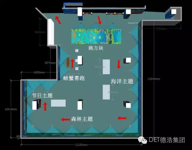 該項(xiàng)目當(dāng)中,投影機(jī)就扮演著極其重要的角色。由于體驗(yàn)空間里的投影機(jī)需要長時(shí)間工作,對光源的要求就顯得非常重要。普通的燈泡光源投影機(jī),雖然剛開始使用時(shí)的色彩飽滿、明亮,但是在使用了大約1500小時(shí)候之后,畫質(zhì)便會(huì)出現(xiàn)明顯的落差,不得不采用更換燈泡的方式解決,當(dāng)需要更換的燈泡數(shù)量大時(shí),對開發(fā)商的運(yùn)營成本來說是有較大壓力的。因此,22臺(tái)DET短焦激光投影機(jī)DET-E3600W,均采用吊頂?shù)陌惭b方式,使投影畫面可投射到墻面、地面,營造良好的互動(dòng)體驗(yàn)。