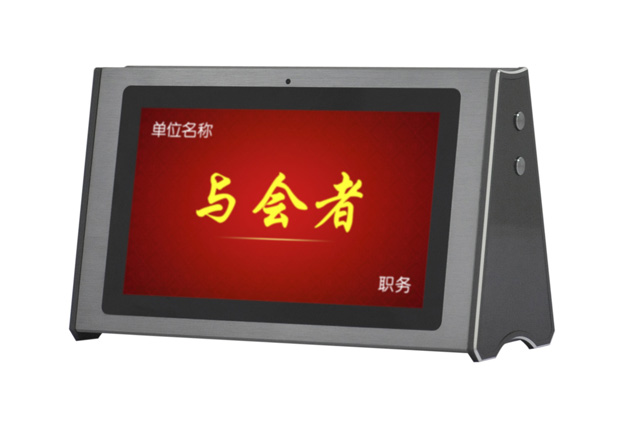 ? 產(chǎn)品特性:全鋁外殼,帶攝像機(jī),網(wǎng)線(POE)供電,數(shù)據(jù)信息無線(wifi)接收,雙面電子桌牌,可一面顯示單位名、人名、職位。能在屏幕上直接書寫人名,職位即可在屏幕上顯示。另一面能顯示部分會(huì)議終端的內(nèi)容如會(huì)議議程,呼叫服務(wù),會(huì)議通知,等等。