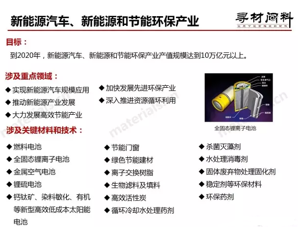 國(guó)務(wù)院對(duì)“十三五”期間我國(guó)戰(zhàn)略性新興產(chǎn)業(yè)發(fā)展目標(biāo)、重點(diǎn)任務(wù)、政策措施等作出全面部署安排?!兑?guī)劃》確定了八方面發(fā)展任務(wù):一是推動(dòng)信息技術(shù)產(chǎn)業(yè)跨越發(fā)展,拓展網(wǎng)絡(luò)經(jīng)濟(jì)新空間;二是促進(jìn)高端裝備與新材料產(chǎn)業(yè)突破發(fā)展,引領(lǐng)中國(guó)制造新跨越;三是加快生物產(chǎn)業(yè)創(chuàng)新發(fā)展步伐,培育生物經(jīng)濟(jì)新動(dòng)力;四是推動(dòng)新能源汽車、新能源和節(jié)能環(huán)保產(chǎn)業(yè)快速壯大,構(gòu)建可持續(xù)發(fā)展新模式;五是促進(jìn)數(shù)字創(chuàng)意產(chǎn)業(yè)蓬勃發(fā)展,創(chuàng)造引領(lǐng)新消費(fèi);六是超前布局戰(zhàn)略性產(chǎn)業(yè),培育未來發(fā)展新優(yōu)勢(shì);七是促進(jìn)戰(zhàn)略性新興產(chǎn)業(yè)集聚發(fā)展,構(gòu)建協(xié)調(diào)發(fā)展新格局;八是推進(jìn)戰(zhàn)略性新興產(chǎn)業(yè)開放發(fā)展,拓展國(guó)際合作新路徑。