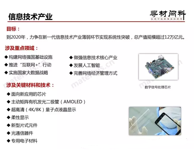 戰(zhàn)略性新興產(chǎn)業(yè)代表新一輪科技革命和產(chǎn)業(yè)變革的方向,是培育發(fā)展新動(dòng)能、獲取未來競(jìng)爭(zhēng)新優(yōu)勢(shì)的關(guān)鍵領(lǐng)域。“十三五”時(shí)期,要把戰(zhàn)略性新興產(chǎn)業(yè)擺在經(jīng)濟(jì)社會(huì)發(fā)展更加突出的位置,大力構(gòu)建現(xiàn)代產(chǎn)業(yè)新體系,推動(dòng)經(jīng)濟(jì)社會(huì)持續(xù)健康發(fā)展。根據(jù)“十三五”規(guī)劃綱要有關(guān)部署,特編制本規(guī)劃,規(guī)劃期為2016—2020年。關(guān)于顯示產(chǎn)業(yè)相關(guān)內(nèi)容,規(guī)劃提到“提升核心基礎(chǔ)硬件供給能力。提升關(guān)鍵芯片設(shè)計(jì)水平,發(fā)展面向新應(yīng)用的芯片。加快16/14納米工藝產(chǎn)業(yè)化和存儲(chǔ)器生產(chǎn)線建設(shè),提升封裝測(cè)試業(yè)技術(shù)水平和產(chǎn)業(yè)集中度,加緊布局后摩爾定律時(shí)代芯片相關(guān)領(lǐng)域。實(shí)現(xiàn)主動(dòng)矩陣有機(jī)發(fā)光二極管(AMOLED)、超高清(4K/8K)量子點(diǎn)液晶顯示、柔性顯示等技術(shù)國(guó)產(chǎn)化突破及規(guī)模應(yīng)用。推動(dòng)智能傳感器、電力電子、印刷電子、半導(dǎo)體照明、慣性導(dǎo)航等領(lǐng)域關(guān)鍵技術(shù)研發(fā)和產(chǎn)業(yè)化,提升新型片式元件、光通信器件、專用電子材料供給保障能力。在材料領(lǐng)域,還專門成立了新材料產(chǎn)業(yè)發(fā)展領(lǐng)導(dǎo)小組: