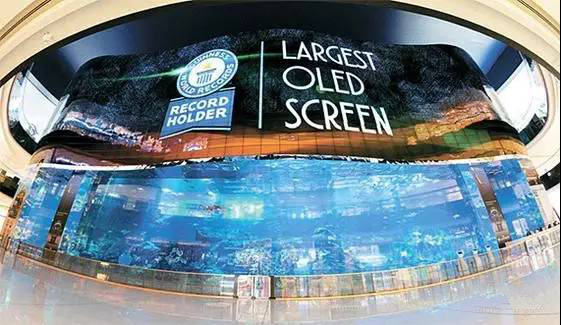報(bào)道中稱,OLED具有薄和輕的特點(diǎn),可以打造成曲線形狀的多種造型。這一大屏幕設(shè)立在水族館的上端,形成溫柔的水波形狀。OLED與液晶(LCD)不同,沒有白光,由像素發(fā)光,不管從哪一角度觀看,色彩都不會(huì)發(fā)生變化,非常適合于用作大屏幕。