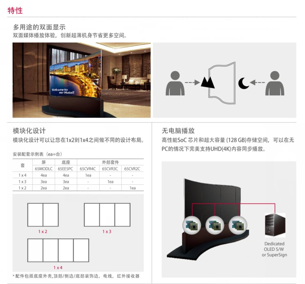 眾所周知,與傳統(tǒng)的顯示屏產(chǎn)品相比,OLED顯示屏有著自身獨特的優(yōu)勢,如輕薄,安裝靈活等,但是,由于處于推廣初期,成本較高,因此,鎖定的必然是品質(zhì)優(yōu)先的高端應用市場,如星級酒店、廣電、文化娛樂、科技館、藝術館、企業(yè)展廳以及高端零售業(yè)等,而LG此次推出的四款OLED數(shù)字標牌顯示器產(chǎn)品,皆是針對這些高端應用市場,如果說它們的誕生驚艷了時光驚艷了歲月有些過了,那么,說它們驚艷了整個行業(yè)則是恰如其分!