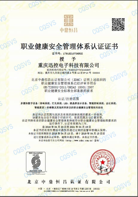 重慶迅控電子科技有限公司于2018年4月20日順利通過(guò)ISO9001質(zhì)量管理體系、ISO14001環(huán)境管理體系、OHSAS18001職業(yè)健康安全管理體系認(rèn)證并獲得ISO9001質(zhì)量管理體系、ISO14001環(huán)境管理體系、OHSAS18001職業(yè)健康安全管理體系認(rèn)證證書(shū)。