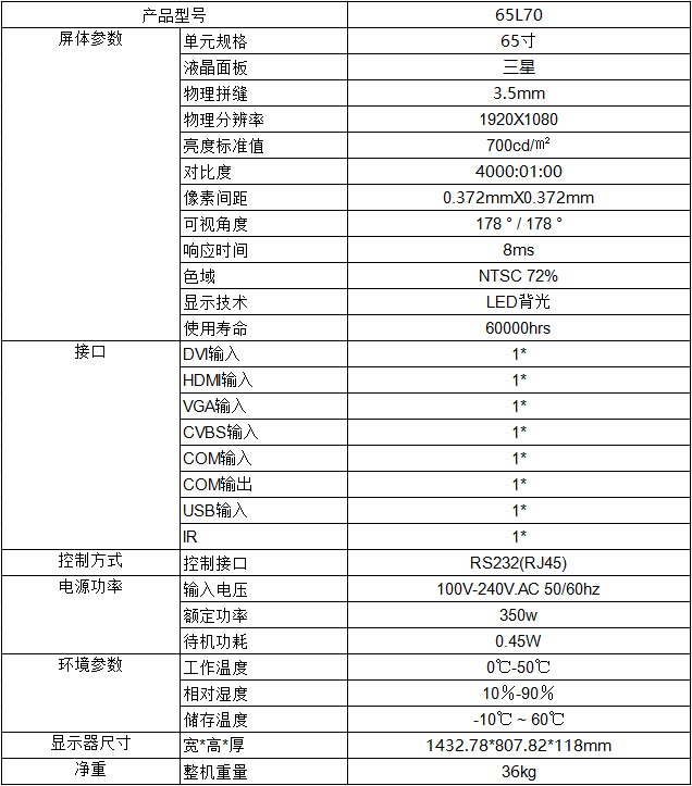 65寸液晶拼接顯示屏的技術(shù)參數(shù):
