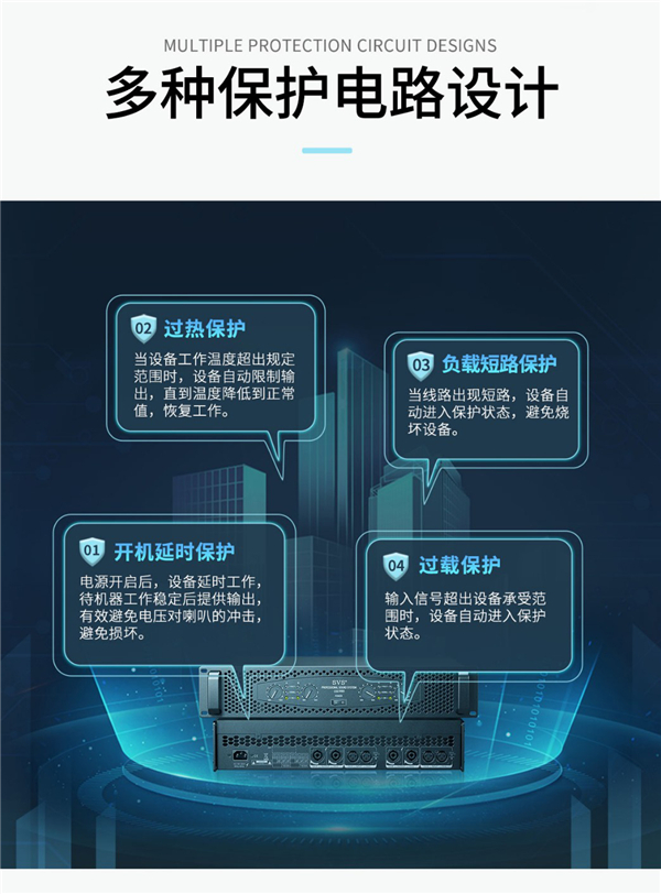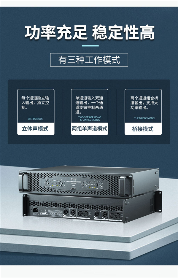 CSD系列功放具有高信噪比、寬電壓、低功耗、高效率等特色,同時具有多重保護:后級燒毀保護、負(fù)載短路保護、過壓保護、直流保護、失真壓限保護等;產(chǎn)品主要材料如膽電容、功率放大管、超靜音滾珠風(fēng)扇等均采用國際大品牌元件; 采用高精度貼片技術(shù),高密度鋁合金散熱,寬電壓大功率開關(guān)電源供電,采用PFC穩(wěn)壓,能量充足,低電壓也能正常工作。