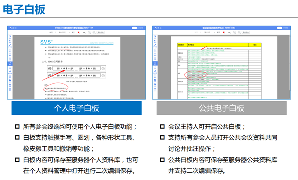 支持電子白板功能,普通參會(huì)者可使用個(gè)人白板,并將內(nèi)容保存至個(gè)人資料庫(kù),會(huì)議主持人可開(kāi)啟公共白板,對(duì)會(huì)議文件進(jìn)行同步編輯,共同手寫(xiě)、批注;