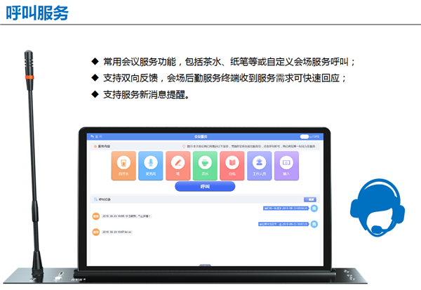 支持會(huì)議服務(wù)功能,如發(fā)送茶水、紙筆、技術(shù)支持等請(qǐng)求,雙向反饋,快速響應(yīng);