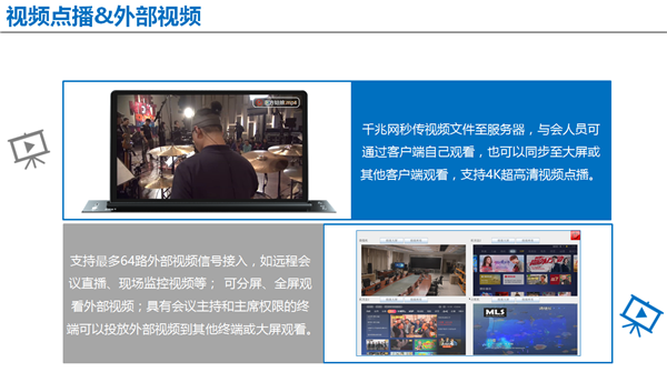 支持視頻點(diǎn)播功能,可選擇獨(dú)自播放或同步至大屏或其他參會(huì)終端等多種播放方式;