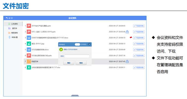 會(huì)議資料下載權(quán)限和源文件查看權(quán)限可設(shè)置是否開(kāi)啟,并支持對(duì)會(huì)議資料和文件夾設(shè)置密碼權(quán)限訪問(wèn);