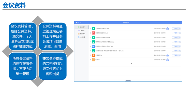 會(huì)議資料支持Word、Excel、PPT等類型,還包括TXT、PDF、JPG、BMP、PNG等文檔格式;