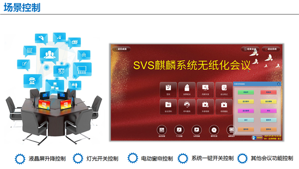 支持中控場(chǎng)景控制功能,主持端可通過(guò)隱藏式面板實(shí)現(xiàn)對(duì)會(huì)場(chǎng)各類設(shè)備進(jìn)行集中控制;