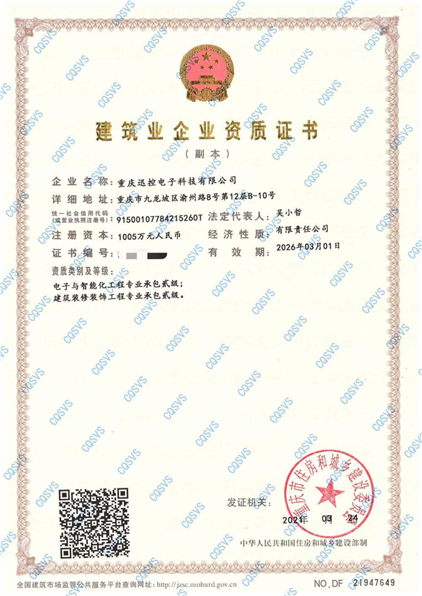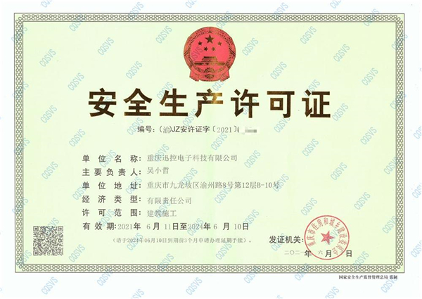 近期,經(jīng)重慶市住房和城鄉(xiāng)建設(shè)委員會審核批準(zhǔn),重慶迅控電子科技有限公司順利獲得電子與智能化工程專業(yè)承包二級、建筑裝修裝飾工程專業(yè)承包二級兩項(xiàng)資質(zhì)證書。同時(shí)成功取得《安全生產(chǎn)許可證》,獲得建筑施工市場的安全準(zhǔn)入資格,促進(jìn)公司安全生產(chǎn)管理工作的制度化、規(guī)范化。