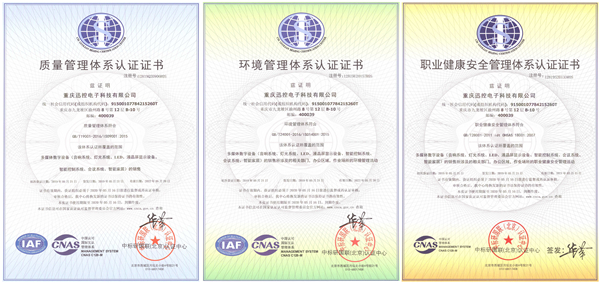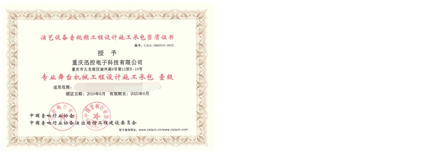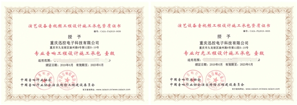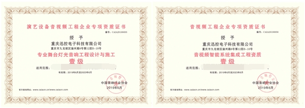 公司擁有雄厚的技術(shù)實力,先后獲得 “國家高新技術(shù)企業(yè)” 證書;獲得ISO9001質(zhì)量管理體系認證、ISO14001環(huán)境管理體系認證、OHSAS18001職業(yè)健康與安全管理體系認證證書;獲得“中國音響行業(yè)協(xié)會:CAIA20150162專業(yè)舞臺燈光音響工程設(shè)計施工壹級資質(zhì)”“中國音響行業(yè)協(xié)會:CAIA20150163音視頻智能系統(tǒng)集成工程資質(zhì)壹級資質(zhì)”“中國音響行業(yè)協(xié)會:CAIA-PA2015-0102專業(yè)音響工程設(shè)計施工承包壹級資質(zhì)”“中國音響行業(yè)協(xié)會:CAIA-PA2015-0091專業(yè)燈光工程設(shè)計施工承包壹級資質(zhì)”“中國音響行業(yè)協(xié)會:CAIA-PA2015-0076專業(yè)舞臺機械工程設(shè)計施工承包壹級資質(zhì)”證書。