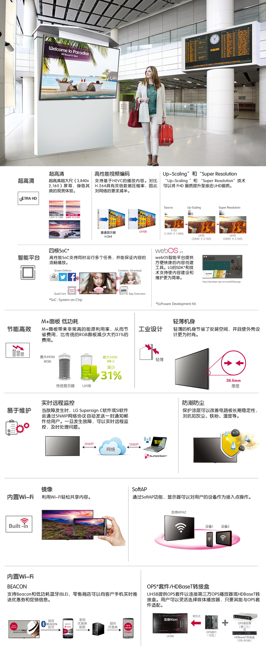 - 溫度傳感器,自動(dòng)亮度感應(yīng)器,殘像防止,故障恢復(fù),內(nèi)置儲(chǔ)存器,內(nèi)置WiFi,USB克隆,內(nèi)容排程,BEACON(開/關(guān)),同步模式,Wake on Lan