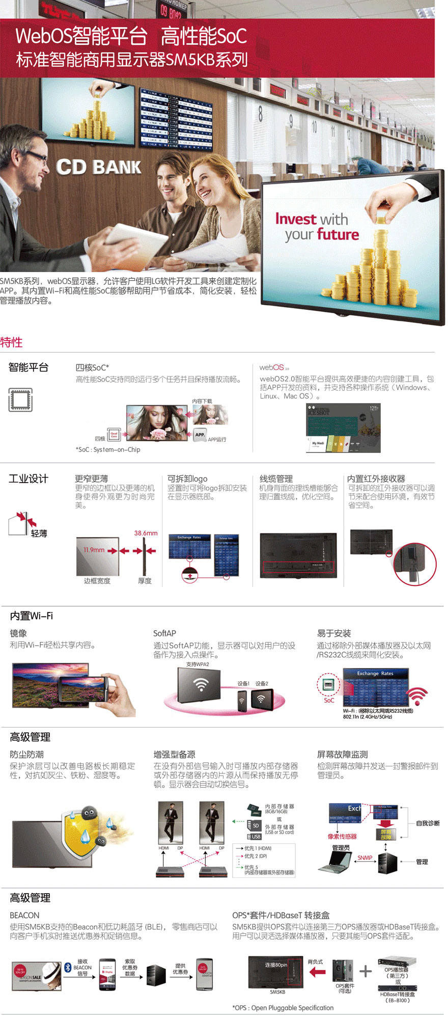 溫度傳感器, ISM殘像防止,Wi-Fi(802.1 In compon built-in),USB克隆,內(nèi)容排程, 同步模式, 電源管理模式,當?shù)貢r間自動設定,Wake on LAN,Pivote Mode,內(nèi)容宣傳0度90度, Fall Over,無信號畫面(最大5MB),BEACON開/關(guān),內(nèi)置模式