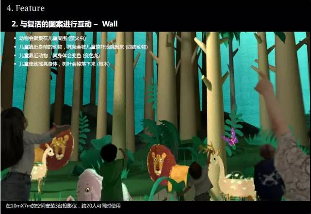Live Forest : 3面大型屏幕與復(fù)活的圖案進(jìn)行聯(lián)動(dòng)(多面影像技術(shù),動(dòng)作識(shí)別技術(shù))